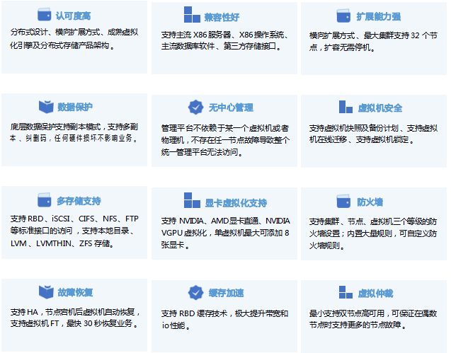 虛擬化場景融合計算和存儲資源,提供具有極簡 、高效 、可靠的虛擬化環境 。提供 OS 一鍵式交互安裝,支持業務的快速上線,靈活擴展 。對各類資源統一管理,按需分配,支持一鍵巡檢 、歷史性能數據統一監控 。支持第三方虛擬化管理平臺 、CDP 保護平臺 。支持數據多副本及 EC 技術 ,大幅提升用戶可得容量 。提供多種安全可靠策略 ,HA 高可用 、備份計劃,虛擬機保護,保障業務連續 。
